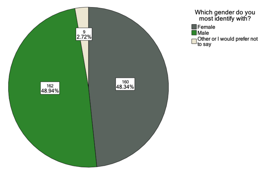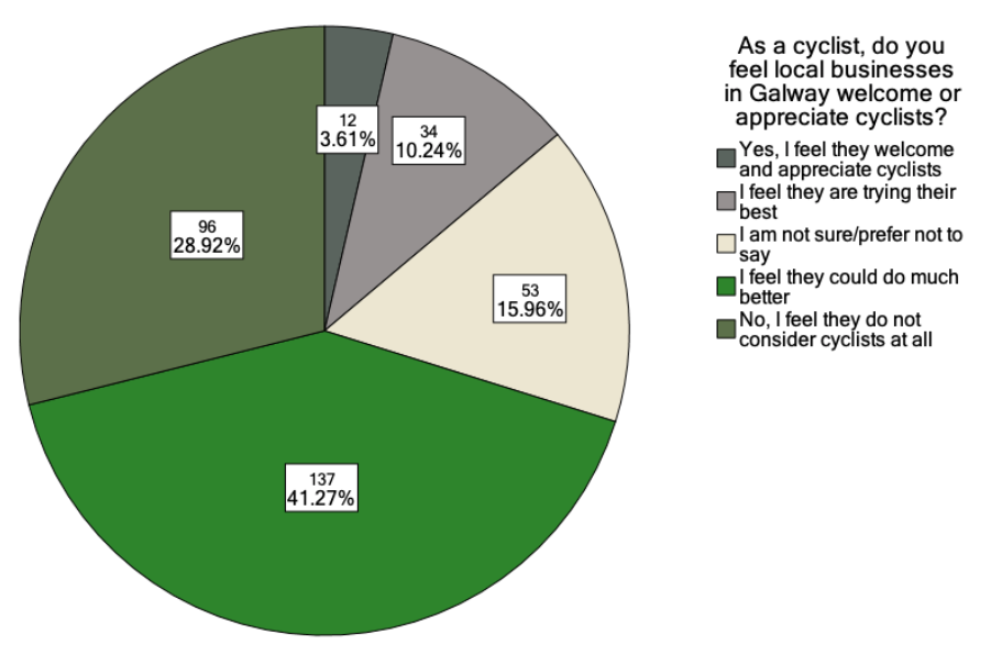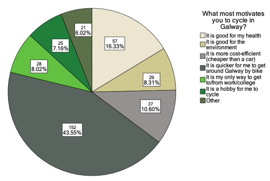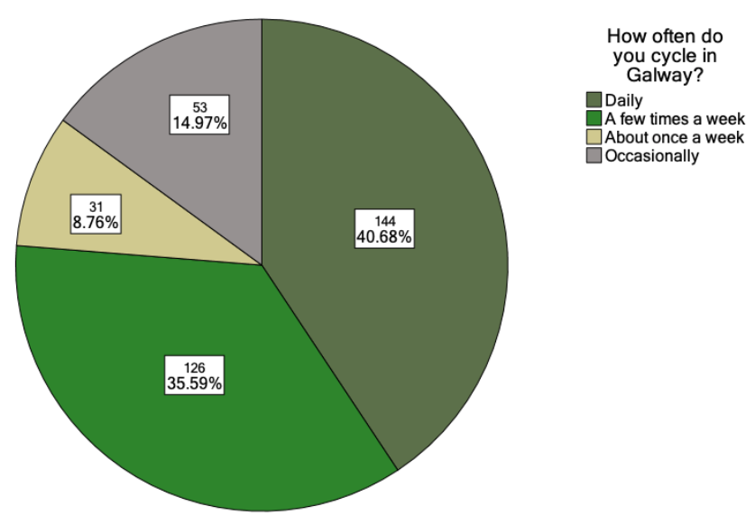 The data for this study was collected as part of the Research Experience and Learning (REaL) initiative at the Social Sciences Research Centre (SSRC) at the University of Galway: a pioneering student/teaching initiative that affords undergraduate students practical and real-world experience in social science research design and methods. A mixed method approach was adopted, which began with designing and developing a questionnaire of ten questions which was then made available online using the LimeSurvey application. A request to participate in a follow-up interview was included in this questionnaire The data gathered from the questionnaire was obtained in two instalments - from Tuesday 18th July 2023 to Wednesday 30th August 2023 and again from Thursday 14th September 2023 until Friday 29th September 2023. A simple random sampling approach was employed and a sample size was determined by some ‘back of the envelope’ calculations. The current population of Galway City and its suburbs stands at 85,910 (CSO 2023a) and the number of individuals in the country who commute to work, school, college or childcare by bicycle was just under 5% (CSO 2023b). This would suggest an approximate cycling population of over 4,000 (N=4,295), and with a confidence level of 95% and a margin of error of 5% the ideal sample size is over 350 (n=353). The motivation for splitting the collection into two time periods was that the first was purposefully focused on cyclists who live or work in the city all year round and the second period focused on students in third-level education in Galway. Many student cyclists leave the city during the summer month returning for the beginning of the teaching semester in September but their perspective on cycling needed to be obtained for this research given they form approximately 20% of the composition of the population of Galway (University of Galway 2023). The total number of fully completed questionnaires, after removing respondents who do not cycle in Galway, was 321 and partially completed 33 making a total of n=354. Several follow up interviews were conducted to obtain deeper insight into the motivations behind cyclist's decision-making.