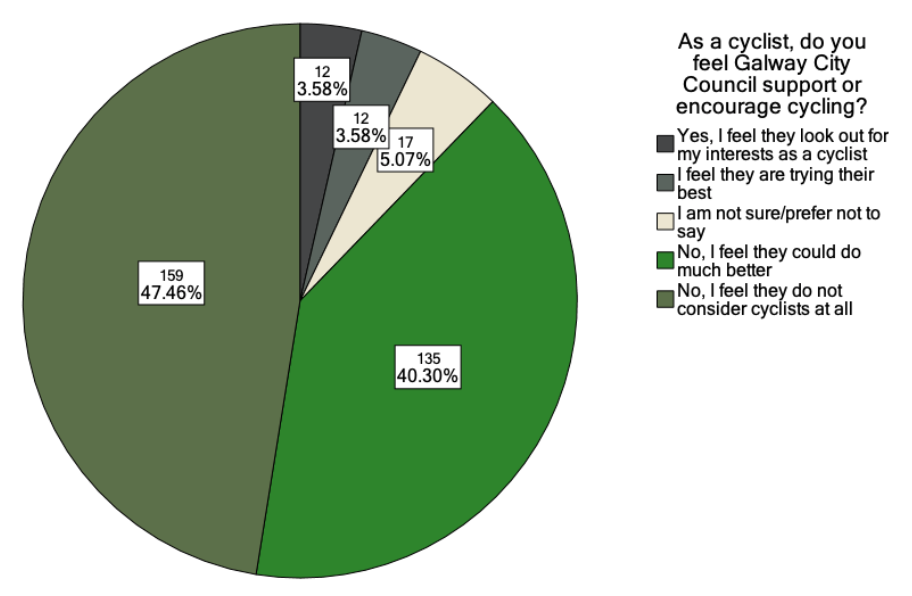The data for this study was collected as part of the Research Experience and Learning (REaL) initiative at the Social Sciences Research Centre (SSRC) at the University of Galway: a pioneering student/teaching initiative that affords undergraduate students practical and real-world experience in social science research design and methods. A mixed method approach was adopted, which began with designing and developing a questionnaire of ten questions which was then made available online using the LimeSurvey application. A request to participate in a follow-up interview was included in this questionnaire The data gathered from the questionnaire was obtained in two instalments - from Tuesday 18th July 2023 to Wednesday 30th August 2023 and again from Thursday 14th September 2023 until Friday 29th September 2023. A simple random sampling approach was employed and a sample size was determined by some ‘back of the envelope’ calculations. The current population of Galway City and its suburbs stands at 85,910 (CSO 2023a) and the number of individuals in the country who commute to work, school, college or childcare by bicycle was just under 5% (CSO 2023b). This would suggest an approximate cycling population of over 4,000 (N=4,295), and with a confidence level of 95% and a margin of error of 5% the ideal sample size is over 350 (n=353). The motivation for splitting the collection into two time periods was that the first was purposefully focused on cyclists who live or work in the city all year round and the second period focused on students in third-level education in Galway. Many student cyclists leave the city during the summer month returning for the beginning of the teaching semester in September but their perspective on cycling needed to be obtained for this research given they form approximately 20% of the composition of the population of Galway (University of Galway 2023). The total number of fully completed questionnaires, after removing respondents who do not cycle in Galway, was 321 and partially completed 33 making a total of n=354. Several follow up interviews were conducted to obtain deeper insight into the motivations behind cyclist's decision-making.